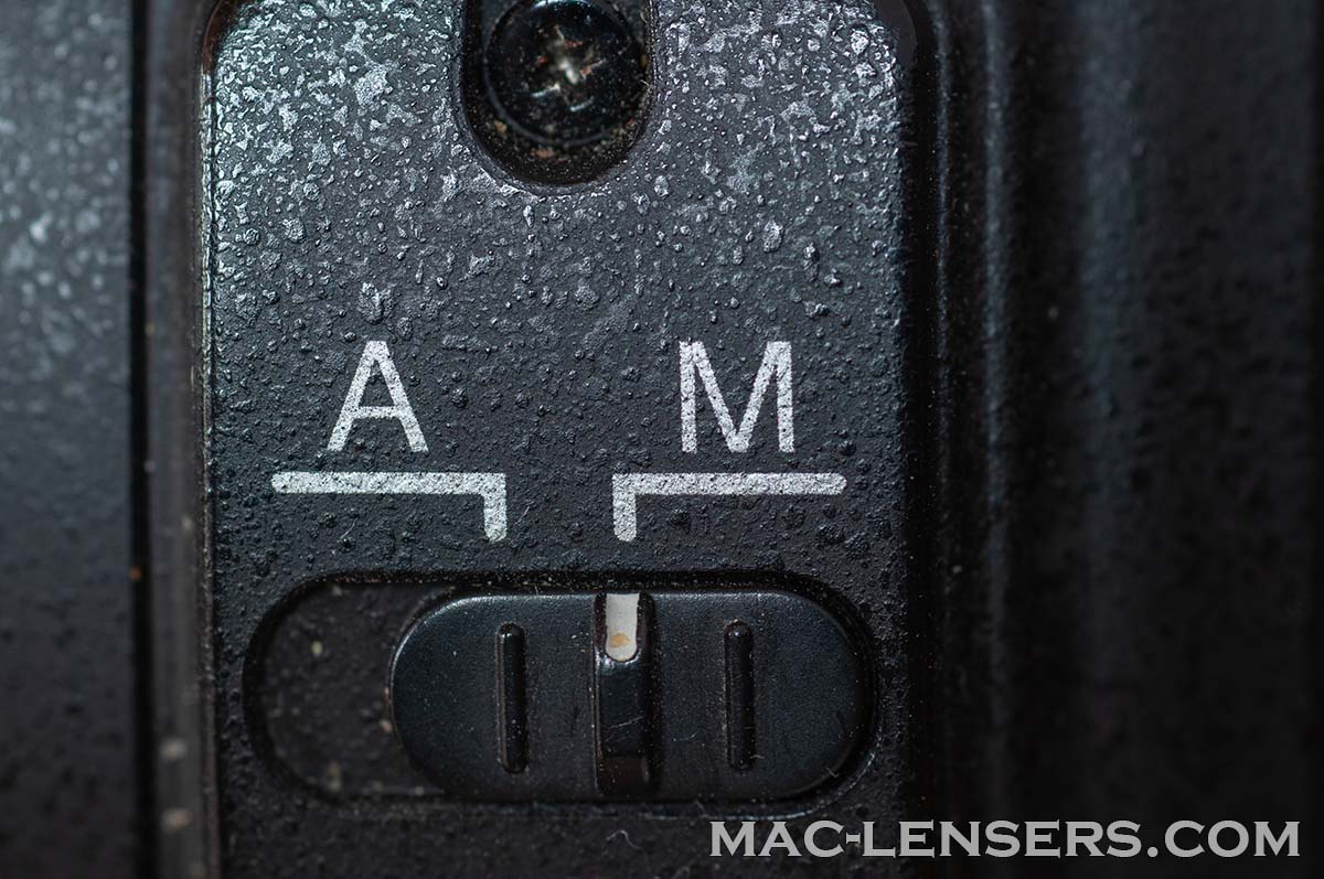 Il existe 2 versions de commutateurs. La première comporte les modes M, commun à toutes les versions, qui correspond à la mise au point Manuelle et le mode A pour la mise au point Automatique. Quand le mode A est sélectionné, il est impossible d'effectuer la mise au point à la main, la bague étant bloquée.