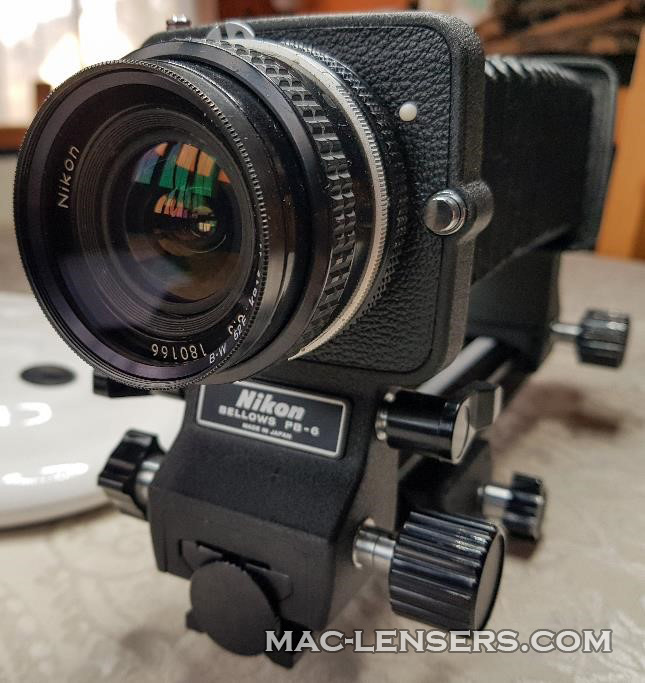 Another day, while repairing my Nikon PB-6 bellows, I found the user manual in pdf. While browsing it, I realized that it was possible to reverse a lens just by flipping the belows front element. This avoids the purchase of reversing rings, that aren't cheap or easy to find either.